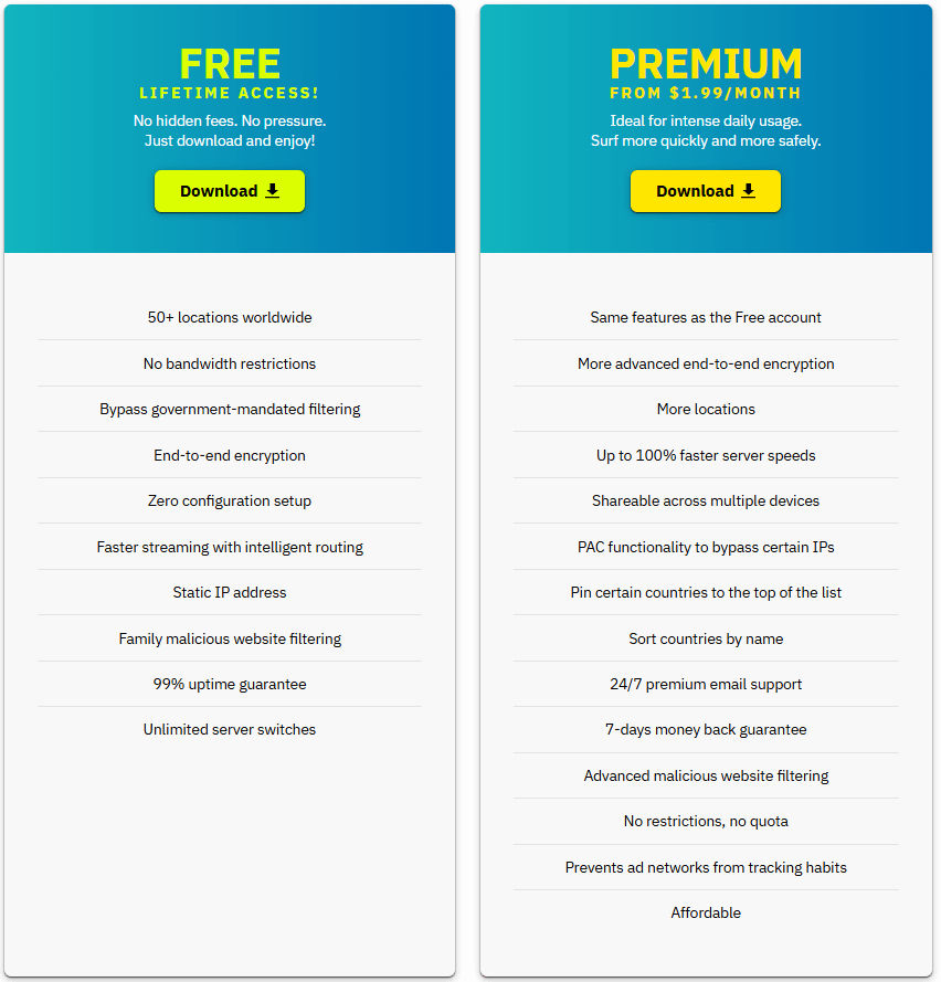 У Hoxx VPN действует простая тарифная сетка: есть бесплатная версия (при этом на ней нет ограничений по скорости и объёму трафика), а также платный тариф за 2 доллара/месяц. Во втором случае вы получаете приоритетное техническое обслуживание, фирменный блокиратор рекламы и выделенный сервер для скачивания габаритных файлов.